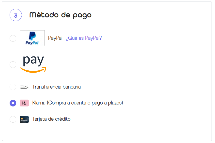 - Klarna (pago a plazos): pague en cuotas mensuales